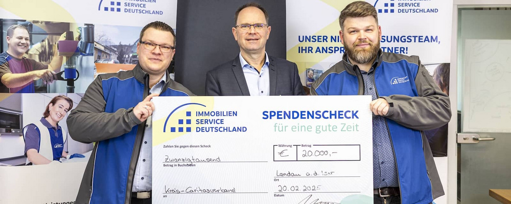 Niederlassungsleiter Fabian Franz Rücker und Regionalleiter Bayern Marcel Böhm überreichten dem Geschäftsführenden Vorstand des Kreis-Caritasverbandes Martin Hohenberger einen Spendencheck in Höhe von 20.000, - Euro. Mit solch einer hohen Spendensumme hatte der Kreis-Caritasverband Landau a. d. Isar nicht gerechnet.